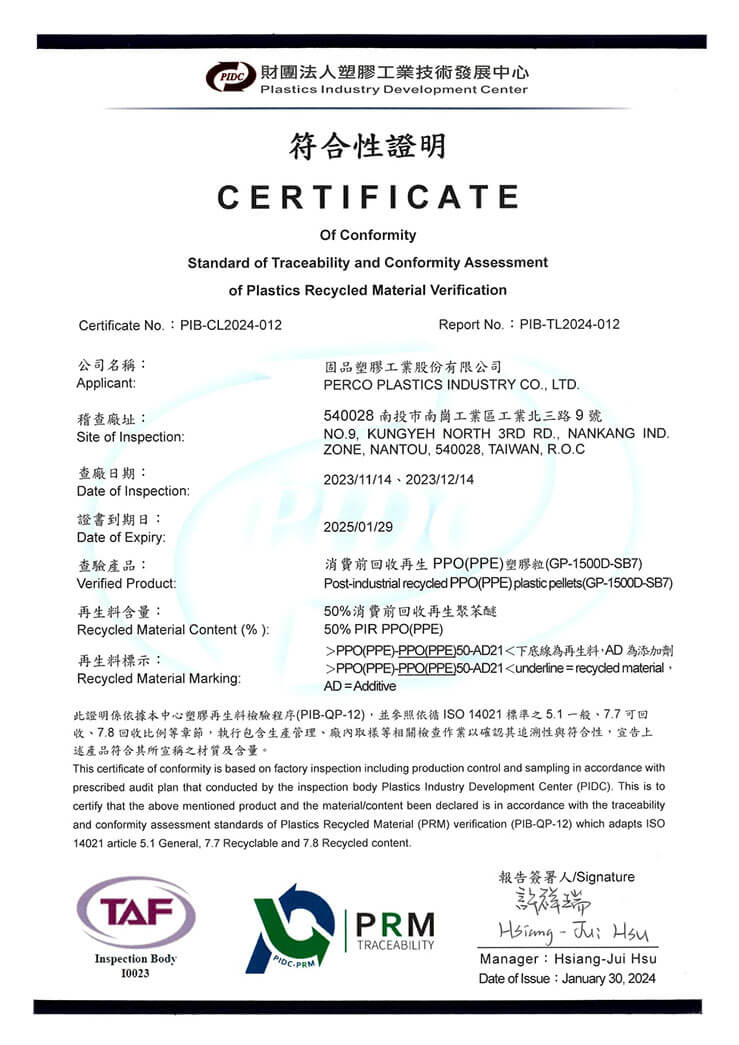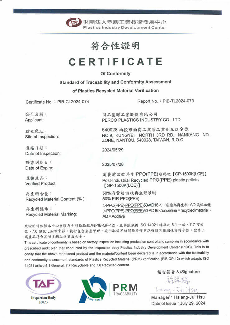 We recognize that future competitiveness will come not only from technology, but also from our commitment to Environmental principles. That is why we have dedicated ourselves to developing and manufacturing low-carbon conductive plastics that not only significantly reduce emissions but also incorporate a high proportion of PRM-certified recycled materials.